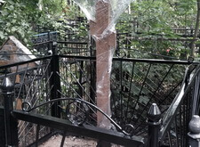 Могила стандартная, не большая. Когда-то здесь стоял гранитный памятник и была высокая ограда. После очередного захоронения плиту убрали в сторону, цветник тоже подняли, переднюю часть ограду демонтировали, установили временный крест.